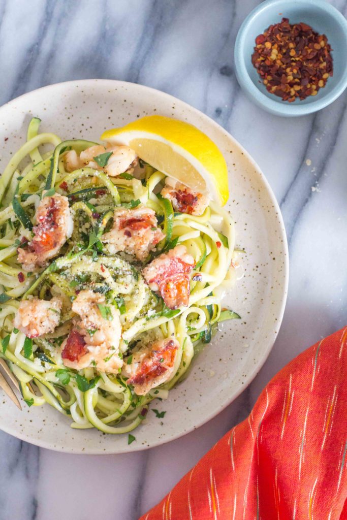 Lobster scampi with a white wine butter sauce served over healthy zucchini noodles! This low-carb zucchini noodles recipe makes the perfect healthy dinner.