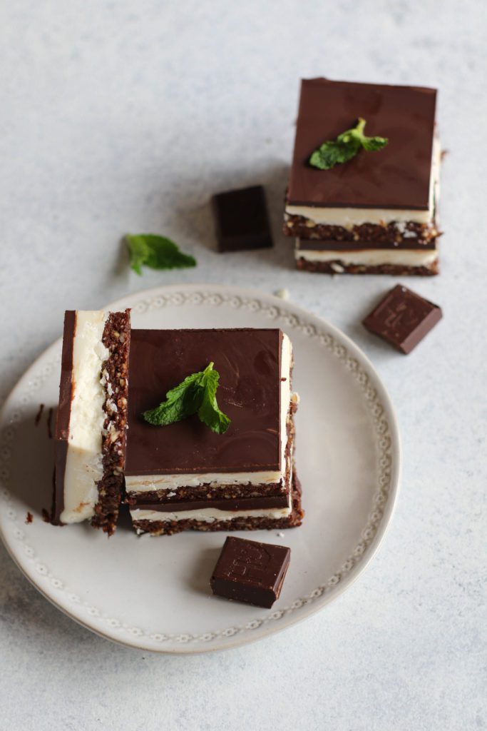Layer Bars | Vegan and grain-free mint dark chocolate coconut layer bars made with a cacao date-nut base, sweet coconut butter center, and mint dark chocolate top.