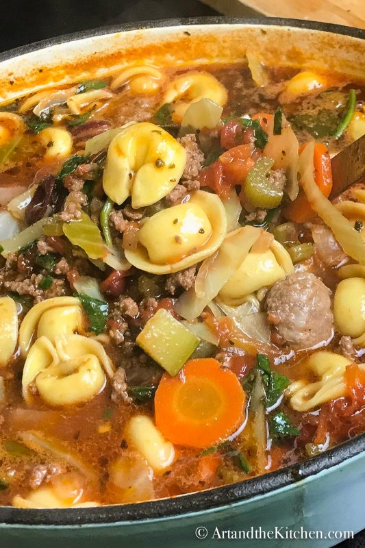 Hearty | Hearty Tortellini Soup is loaded with vegetables, ground beef, Italian sausage and tortellini simmered in a savoury tomato beef stock.