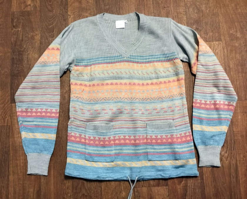 Top | Vintage 1970s Deadstock Patterned Top/Sweater UK Size 10/12 Original 1970s deadstock vintage long sleeve 100% acrylic top/sweater. Deep v-neck with 2 front pockets and tie to hem, ribbed collar and cuffs. Vintage clothing, deadstock, vintage sweater, 1970s clothing, 70s style, 70s fashion, 70s sweater, 70s clothing