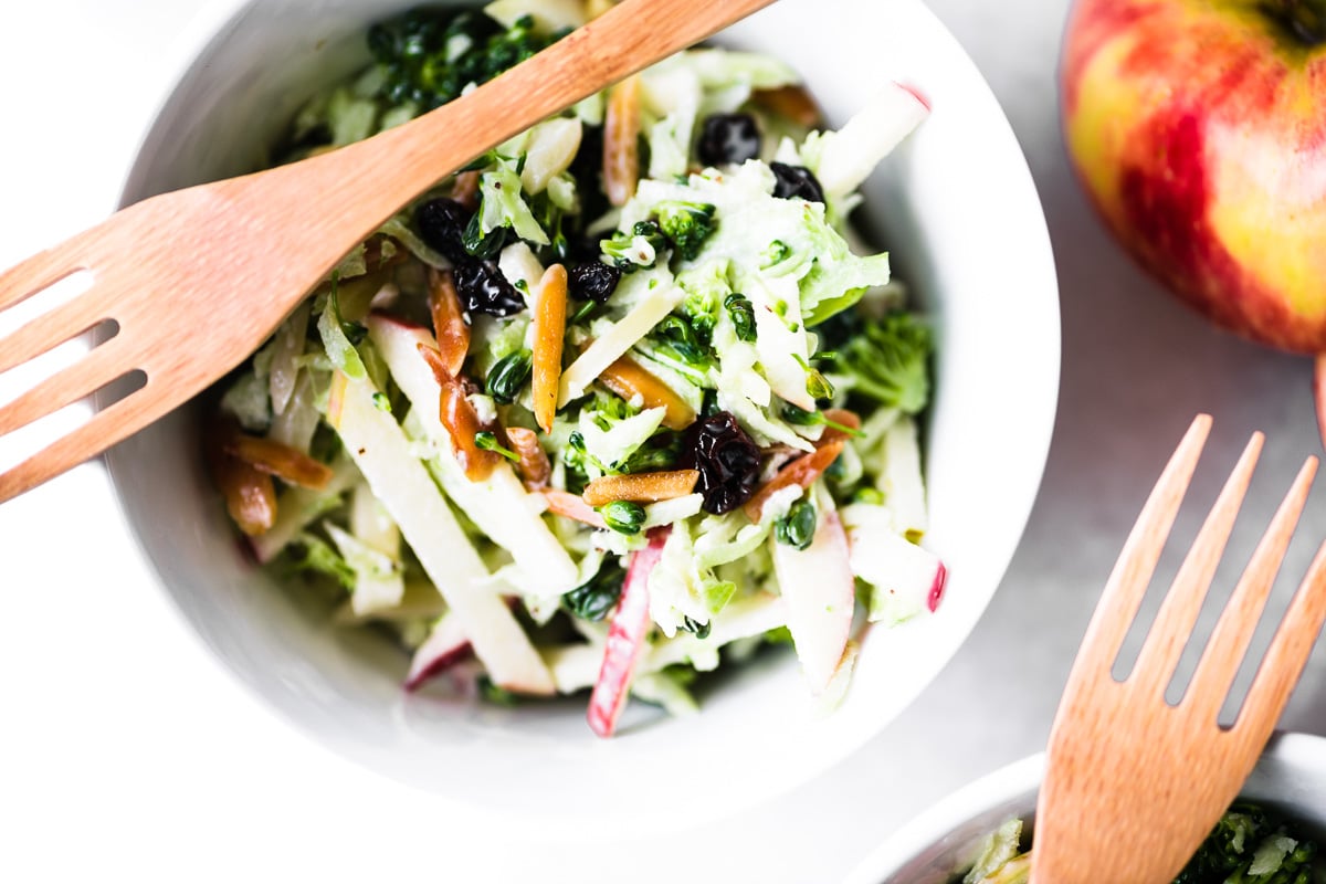 Broccoli | Broccoli Honeycrisp Slaw ~ shredded broccoli, crisp apples, currants, & toasted almonds combine with a creamy cider dressing in one heck of a summer salad.