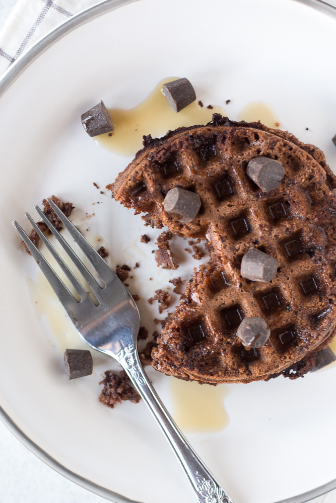 #Paleo Chocolate Chip | Paleo chocolate chip waffles made with almond flour, cacao powder, canned coconut milk, and dark chocolate chunks. Serve with maple syrup for breakfast!